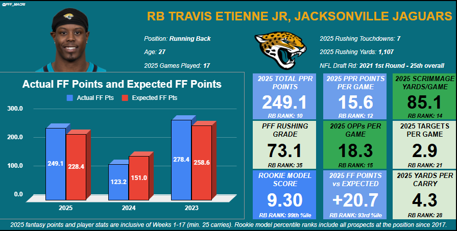 The Chiefs are potentially going to lose 85% of their running back carries from this past season and 81% of their running back routes, making them arguably the most running back-needy offense heading into this 2026 offseason. While they will be linked to many free-agent running backs, and potentially even top rookie backs, Etienne could make the most sense for the team right now.