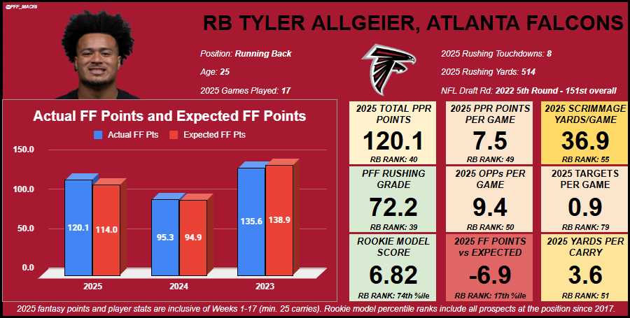 Allgeier has quietly delivered as a solid and capable NFL running back, mostly backing up Bijan Robinson for the majority of his career in Atlanta. He has shown enough to be coveted on the open market, as well. Allgeier has earned a very strong 91.1 PFF rushing grade since entering the league (2022), which ranks tied for 12th among 46 backs with at least 500 carries over that span.
