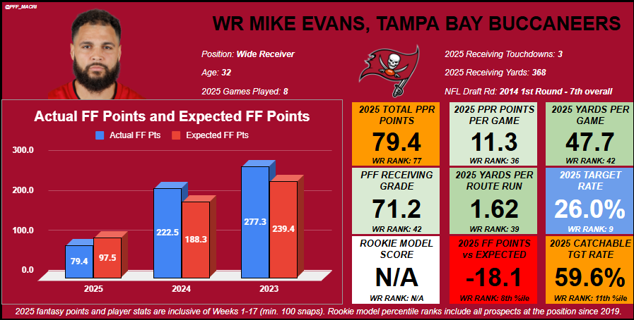 Evans is set to hit free agency in earnest for the first time in his career, coming off the first of his 12 NFL seasons where he did not hit 1,000 receiving yards. Injuries held Evans back in 2025, although he’s one year removed from a career-best 2.52 yards per route run and the second-best PFF receiving grade (90.2) of his career in 2024.