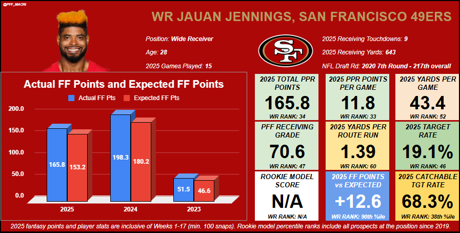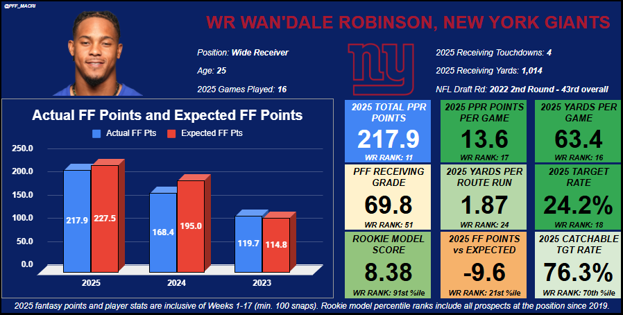 Robinson was able to provide more while Malik Nabers was out this past season, although we’ve more than likely seen his ceiling for fantasy, given his WR11 finish in 2025. Robinson doesn’t have to be a clear team No. 1 wide receiver to be a fantasy starter. A strong offense that will get him the ball a ton can still propel him to fantasy success.
