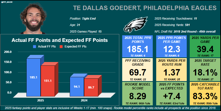 Goedert scored a career-high 11 receiving touchdowns this past season, and while he’s unlikely to reach that number in 2026 in a less-effective offense, he should still be a go-to receiving option in that area of the field. Goedert isn’t quite as effective a receiver as he once was, but in a scenario where he’s going to be another piece of a rebuilding offense, there’s no reason he can’t deliver starting fantasy production.