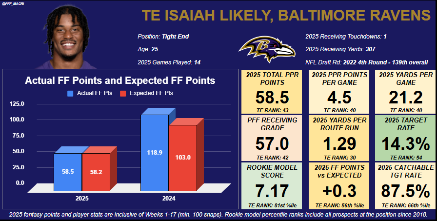 Likely’s career has been marred by injuries thus far, which will be a concern. However, he’s been a relatively effective receiving option when on the field. His 1.45 career yards per route run average ranks 17th among 40 qualifying tight ends since he entered the league in 2022, and a fresh start and a healthy season could finally be the combination he needs to emerge as a top-12 fantasy option for the first time in his career.