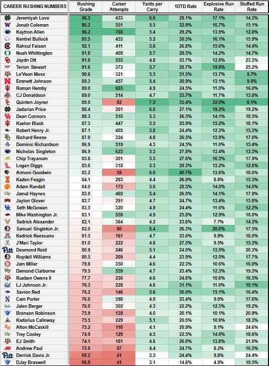Starting with the basics, this is an overview of how each running back performed in typical metrics across all situations during their college career.