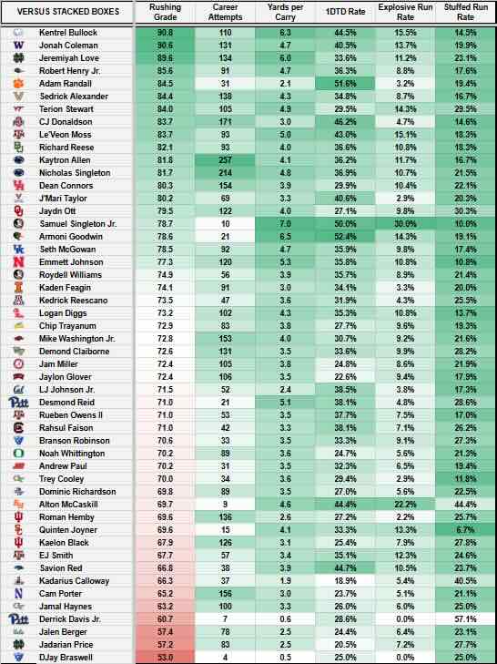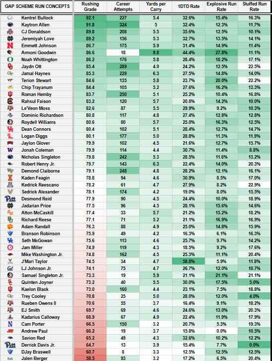 The Penn State backs, Allen and Singleton, have faced the most stacked boxes from this year’s class and have performed relatively well in those situations, as Allen stood out with a top-10 stuffed run rate (16.7%) and explosive run rate (11.7%).