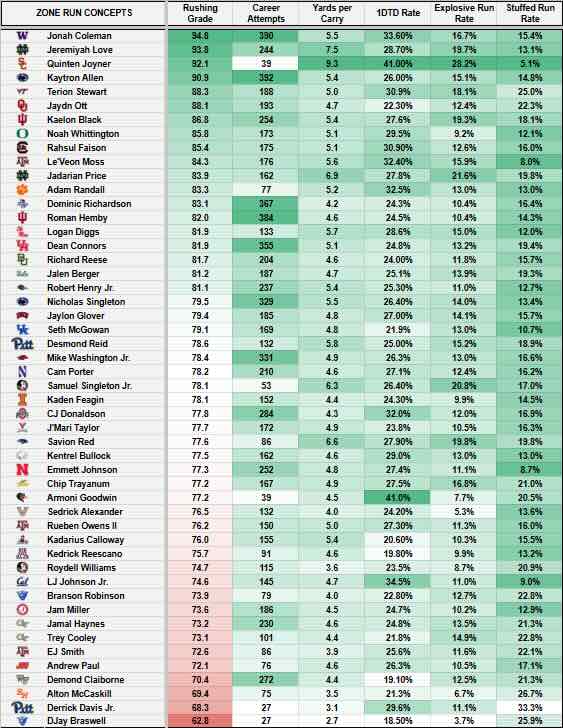 Jonah Coleman owns the highest career rushing grade from zone concept runs, though he is closer to average in that regard in gap-scheme runs. As a potential top-three pick at the position in this class, he’ll ideally fit in any scheme, though it’s worth noting that a more gap-heavy run scheme might not be ideal for his efficiency.