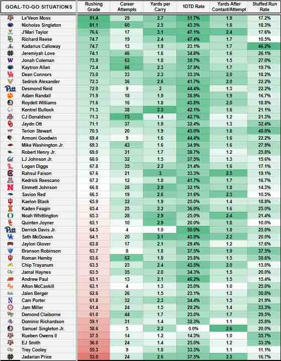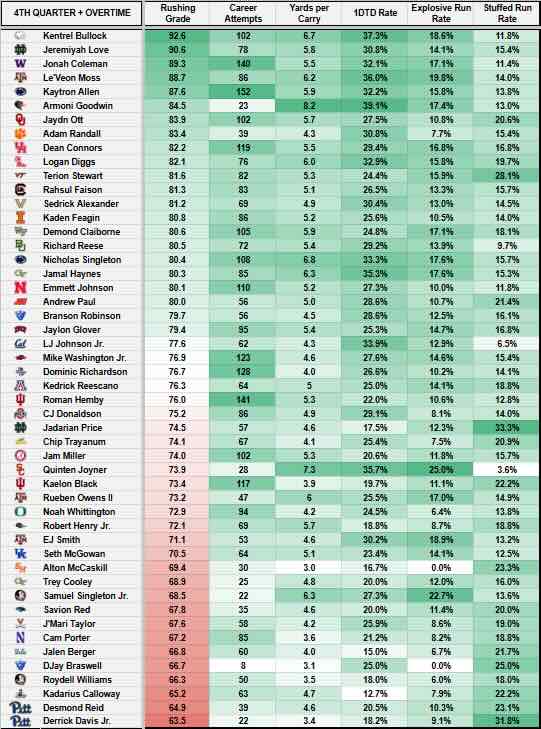 How running backs perform in late-game situations can also be a key part of understanding who they are as a prospect. These numbers remove any “garbage time” situations where one team has put the game out of reach. Instead, focus on closer late-game situations to get a sense of which backs still have the stamina to deliver strong numbers and make the biggest difference for their respective offenses.