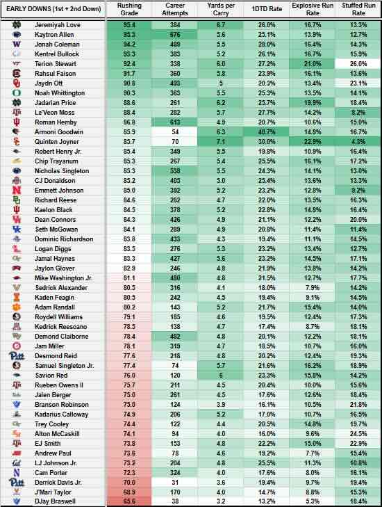 First and second downs are where most rushing attempts come, so it’s also going to be important to identify those who have the most success on those key rushing downs.
