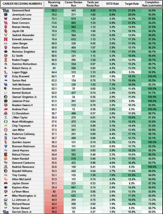 Mike Washington Jr. stands out here with a red flag again, as he has a lot of experience as a receiver, though his 44.9 career receiving grade is one of the worst in this entire class. NFL teams and fantasy managers may fall in love with the speed and athleticism, but it’s worth noting that there are concerns in his data profile for him potentially translating to the next level.