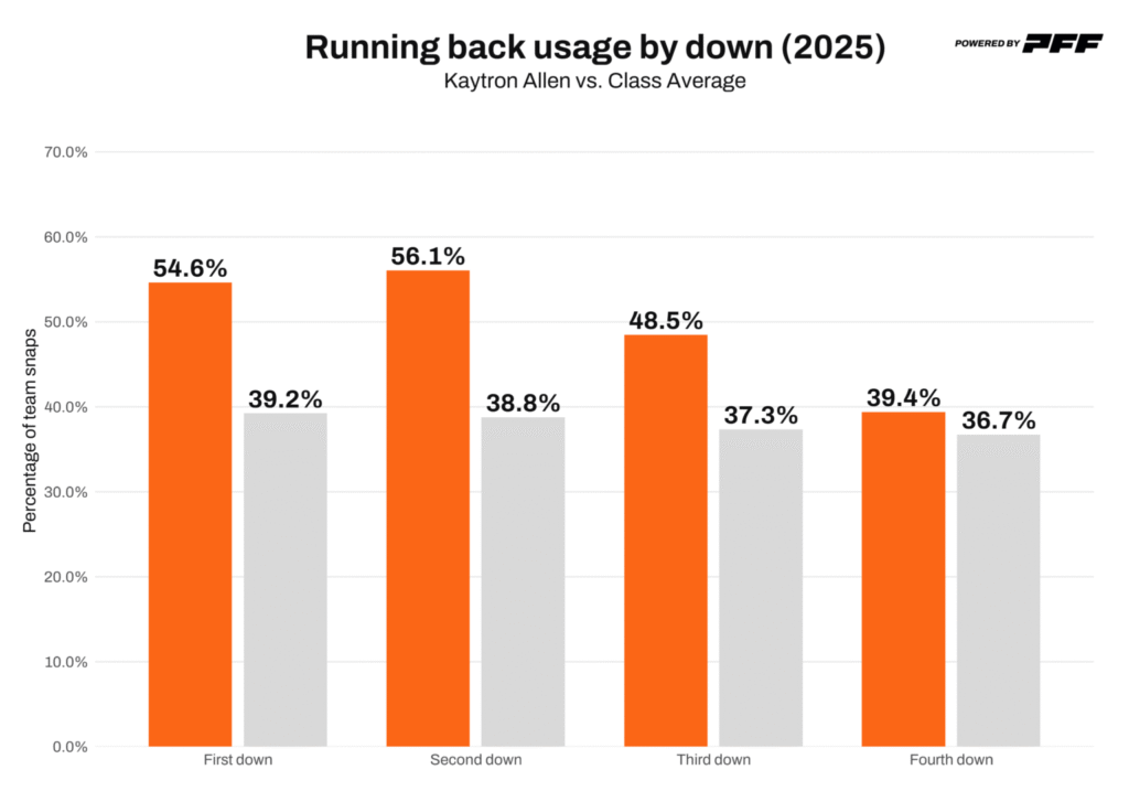 Another key factor is his experience working in a committee. Many late-round picks transition from being the focal point of their college offense to a depth role in the NFL. Allen has already shown comfort rotating in and out alongside Nicholas Singleton.