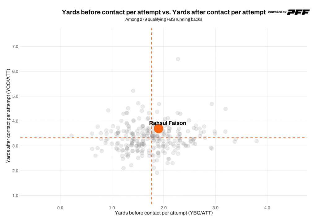 Faison could still stand out early in the right situation. Coaches will value his reliability — he has just two drops across three FBS seasons and has not lost a fumble on 411 career carries.