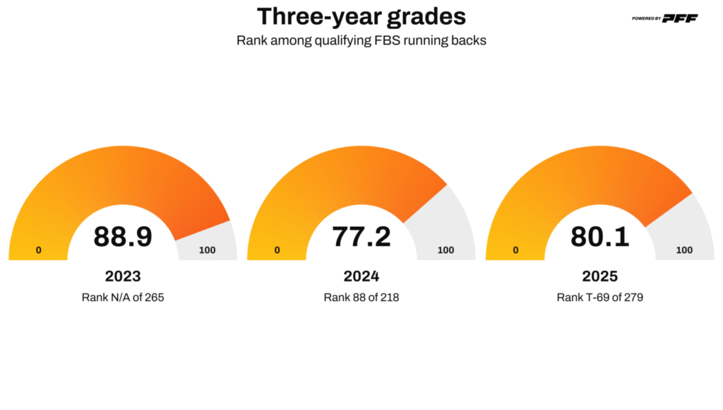 Ranked RB30 on PFF’s board, Bullock’s NFL outlook will depend heavily on landing spot, likely as an undrafted free agent. Unlike several players ranked ahead of him, he enters the league coming off the most productive stretch of his career, a key factor in projecting late-round and UDFA running backs.
